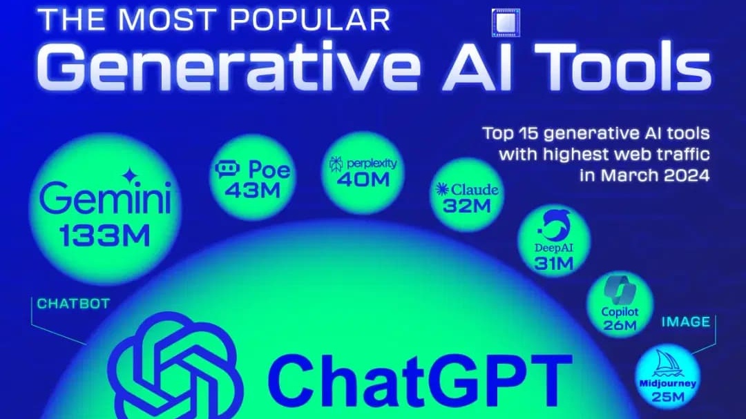 وفقًا لدراسة بحثية جديدة أجرتها مجموعة من الباحثين في البنك الدولي، يظهر أن هناك عددًا من الأدوات التي تتصدر القائمة عندما يتعلق الأمر بشعبية أدوات الذكاء الاصطناعي التوليدي، وقد تم تصنيف هذه الأدوات بناءً على حركة المرور عبر الإنترنت لشهر مارس 2024.
